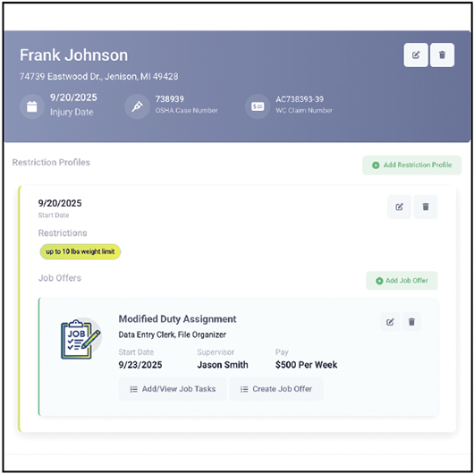 At its core is the Case Manager, which employers can use to track restrictions, assign safe tasks, and generate offers. Each case becomes a centralized hub, storing restrictions, job offers, and updates over time—eliminating confusing paperwork and keeping compliance intact.