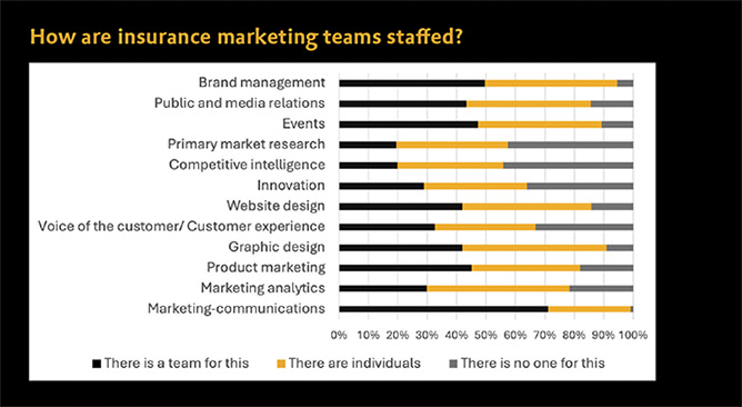 Ultimately, to be successful, marketing requires a seat at the C-suite table. Marketing must be aligned closely with business strategy, business development and sales. But it’s not always that way in insurance organizations, the research found.