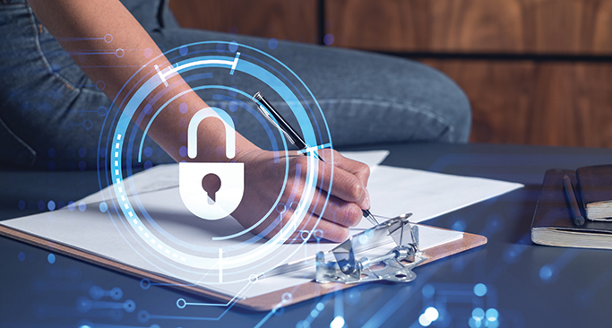 A businesswoman in casual wear signing the contract to prevent probability of risks in cyber security. Padlock Hologram icons over the working desk.