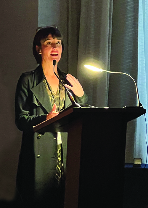Maggie Bender-Johnson addresses the attendees after receiving the 2023 Community Service Award.