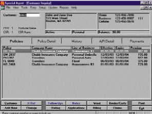 "Open a customer account and you see a tab system," he says. "The tabs are: Search, Client, Policy, Memos, Billing, Images, Letters, and Forms. If you want to review a client's policies, for instance, you click the Policy tab and there they are. The client record can have an unlimited number of policies and they can be of any type. If you click the Billing tab, you can see the open bills or create new ones. Every letter you write for the client is saved so later you can see a trail of the renewal notice, the change of address, etc. All the forms you've ever done for the client are stored--ACORD forms, ID cards, etc."