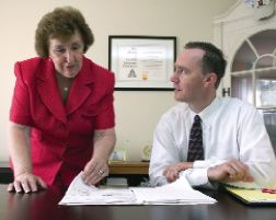 As one of only eight New England Region recipients of Travelers' 2003 "Personal Lines High Achiever" award, Apple Valley Agency Personal Lines Account Manager Joan M. Larochelle, AAI, ACSR, (seated) meets with Travelers Personal Lines Agency Manager (New England Region) Paula Brewer.