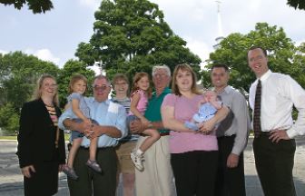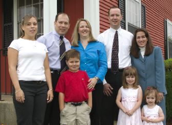 A testament to their consistent level of service over the years is that Apple Valley and Scituate have provided service to four generations of the Dexter family. Flanked by Nancy and David is family head Allen Dexter (the adult in the middle), who has been a personal and commercial lines client at Scituate for at least 65 years. His daughter and son (the adults on Allen's right) purchased Allen's oil delivery service, which was Scituate's largest account for a time. On Allen's left are two of his adult grandchildren who have been agency clients. The younger children represent the fourth generation to benefit from the services of Apple Valley and Scituate agencies. Several other family members and spouses also own businesses that are insured by the agencies.