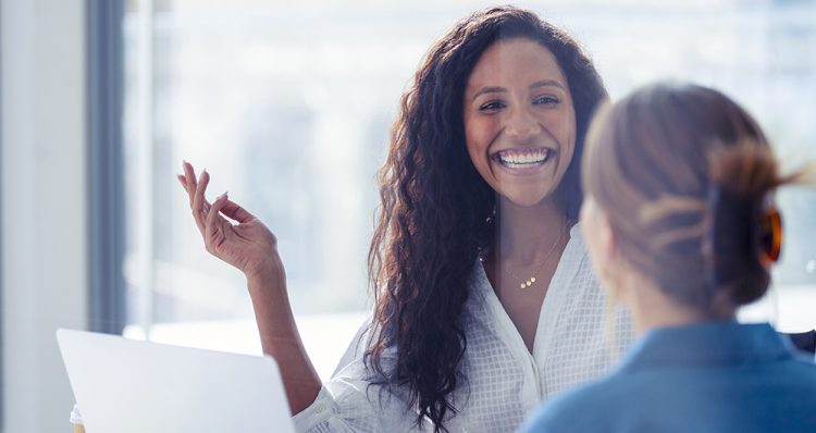 Business colleagues having a conversation. They are both young business people casually dressed in a modern office. Could be an interview or consultant working with a client. She is listening and smiling. One person has her back to us. Mixed ethnic group. One is African American and the other is Caucasian